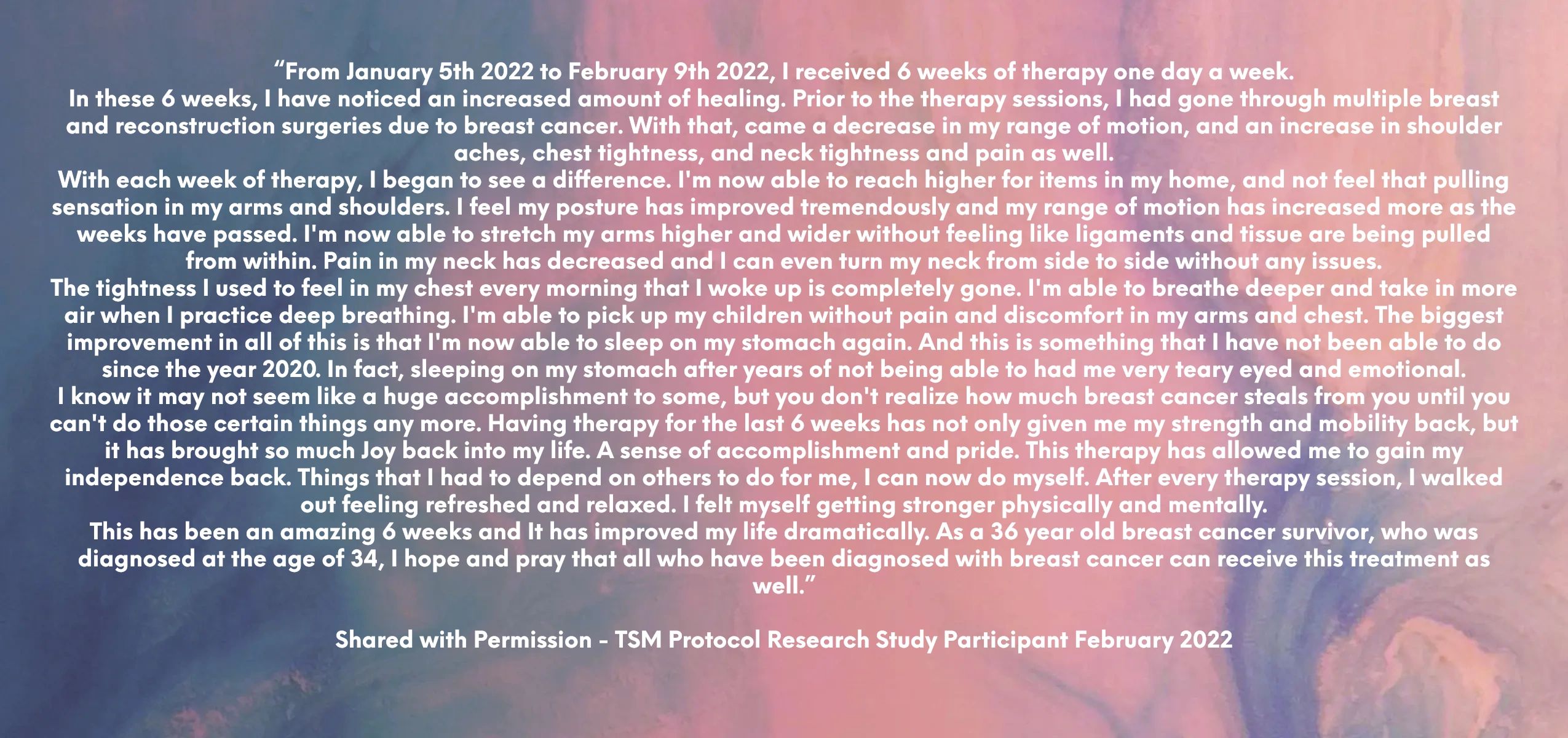 The impact of The Spurgeon Method® cannot be overstated. Its success stories echo the transformative power of personalized care. A poignant example is a patient who had been enduring pain and limited mobility for seven years following surgery. In just 45 minutes of treatment, she regained her range of motion and her zest for life. Such stories underline the potential for renewed hope and joy that this method can bring to countless survivors.